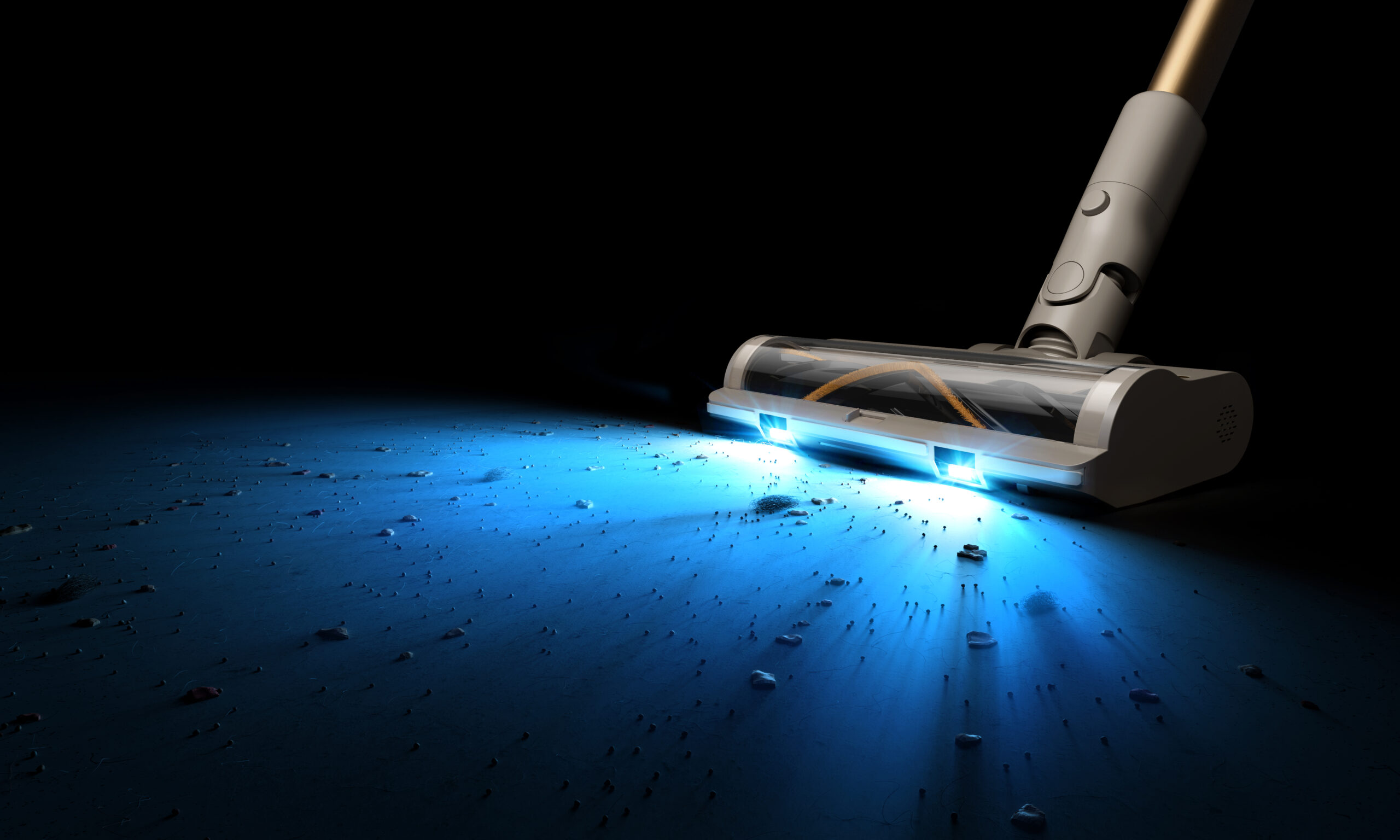 Multi-surface brush is equipped with blue LEDs to reveal dust in shadowy corners. The brush with lights effectively uncovered dust, hair, and fur on surfaces requiring cleaning.